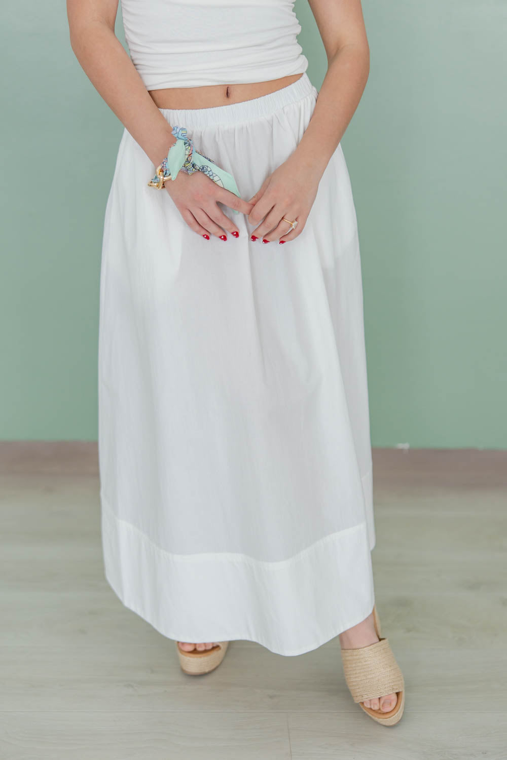 The Quiet Desire High Waist Midi Skirt is the kind of piece you will build outfits around. The A-line shape creates a flattering drape that moves with you, while the midi length offers comfortable coverage that still feels feminine. A gathered elastic waistband makes it easy to pull on and go, giving you comfort without sacrificing style. Functional side pockets keep your essentials close, and the thick hem adds structure so it hangs beautifully. Made from 100% cotton and available in classic black or white, this is the effortless staple that works year round with everything in your closet.