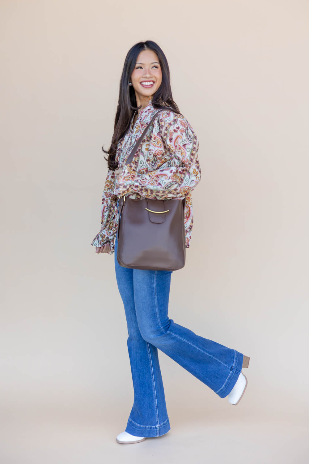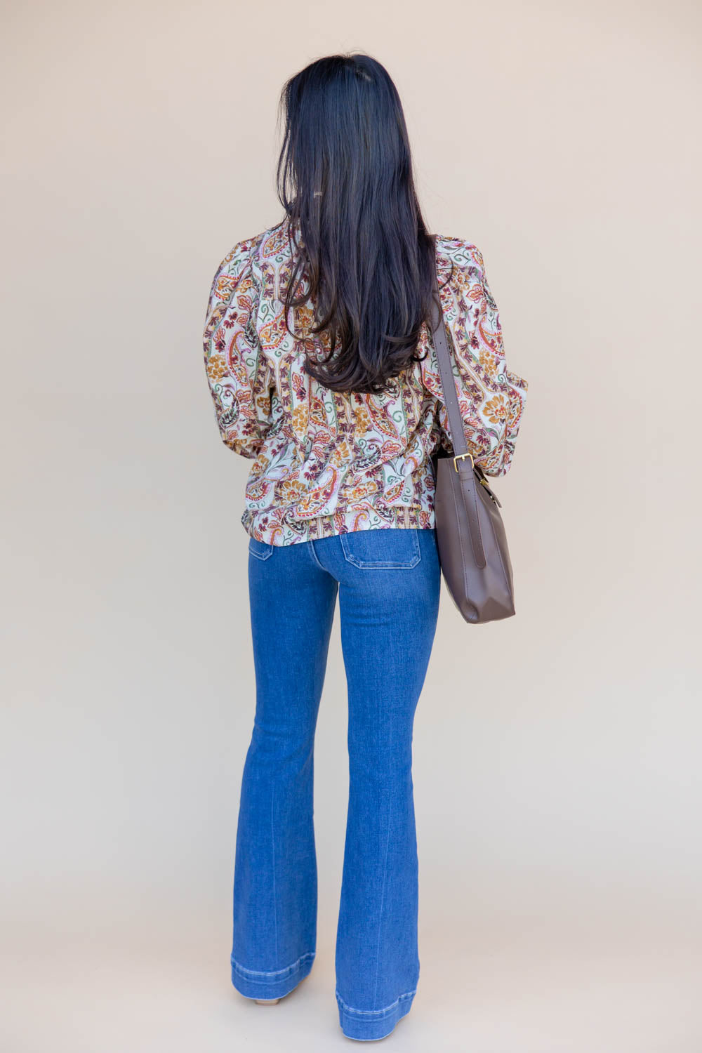 The Paisley Wishes Long Sleeve Blouse is made for cozy nights out and dressed up days in. With a relaxed, true to size fit and hip-length cut, it drapes effortlessly while still feeling polished. The standing pleated collar and v-neckline add a touch of vintage charm, complemented by delicate placket detailing down the front. Long puff sleeves with gathered cuffs bring a feminine finish, and the warm-toned paisley print gives it that seasonal richness you’ll want to wear on repeat. Pair it with denim for a casual vibe or tuck it into trousers for a more refined look—this blouse does both with ease.