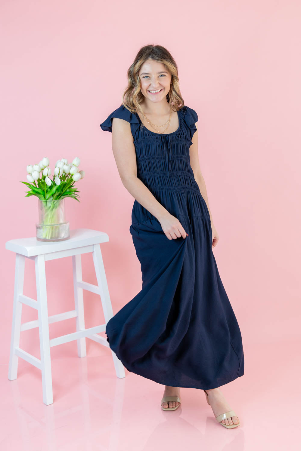 The Refined Romance Dress is made for days when you want to feel effortlessly beautiful. The flowy A line silhouette creates graceful movement, while the maxi length adds an easy, elongated shape. A round neckline keeps it timeless, and ruffled cap sleeves bring a soft, feminine touch. The shirred, gathered bodice offers a flattering, flexible fit that moves with you. Finished with tiered detailing and a delicate drawstring bow, this is the kind of dress that feels romantic yet completely wearable.
