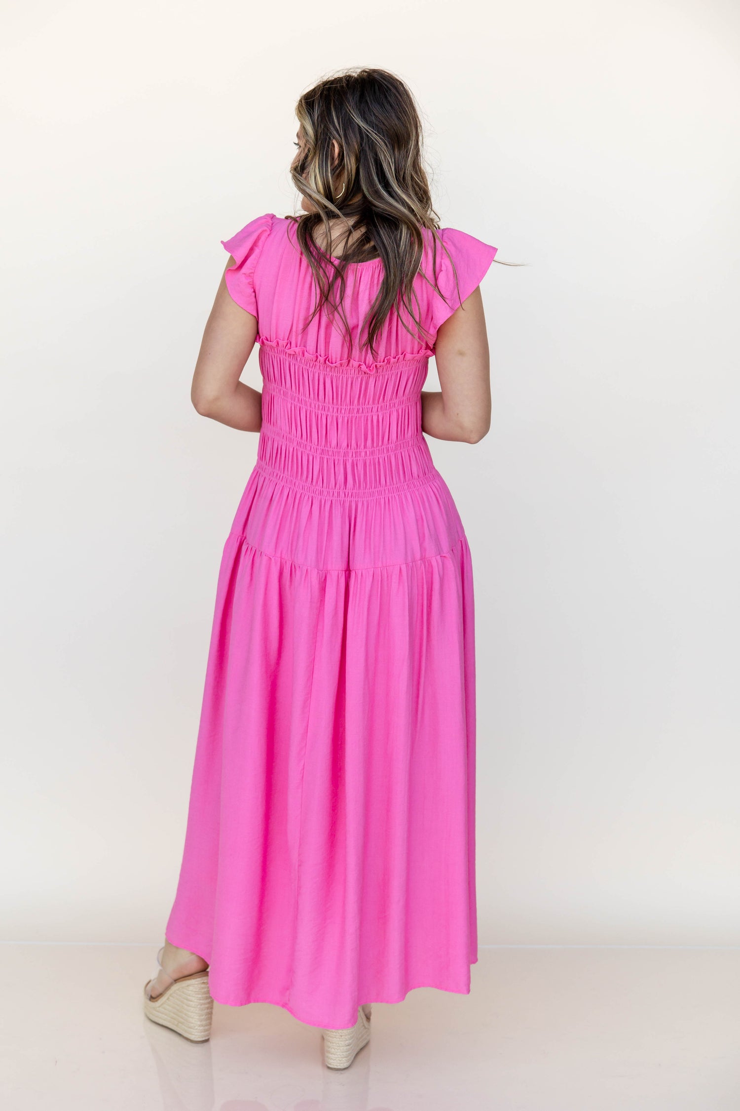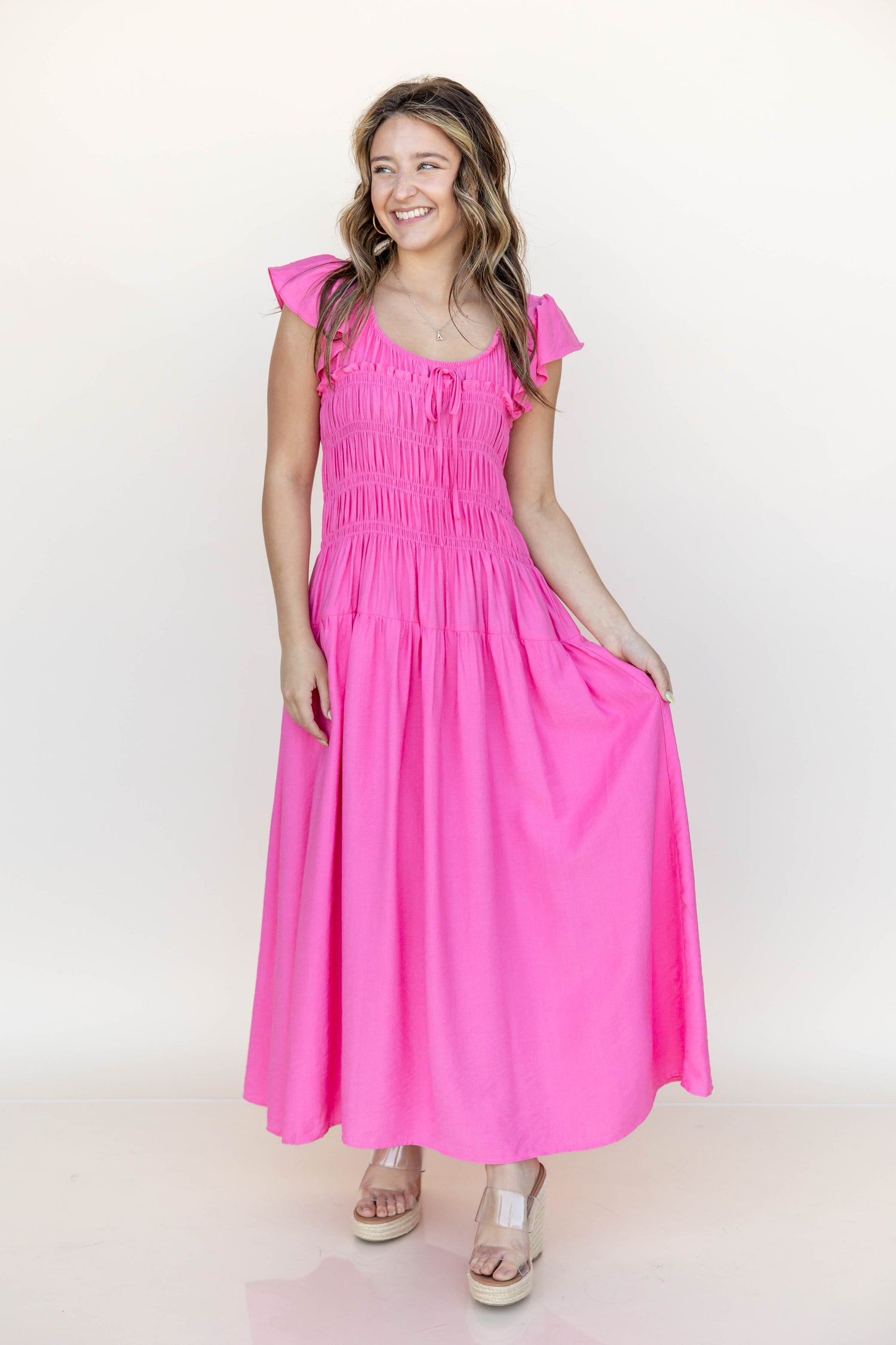 The Refined Romance Dress is made for days when you want to feel effortlessly beautiful. The flowy A line silhouette creates graceful movement, while the maxi length adds an easy, elongated shape. A round neckline keeps it timeless, and ruffled cap sleeves bring a soft, feminine touch. The shirred, gathered bodice offers a flattering, flexible fit that moves with you. Finished with tiered detailing and a delicate drawstring bow, this is the kind of dress that feels romantic yet completely wearable.