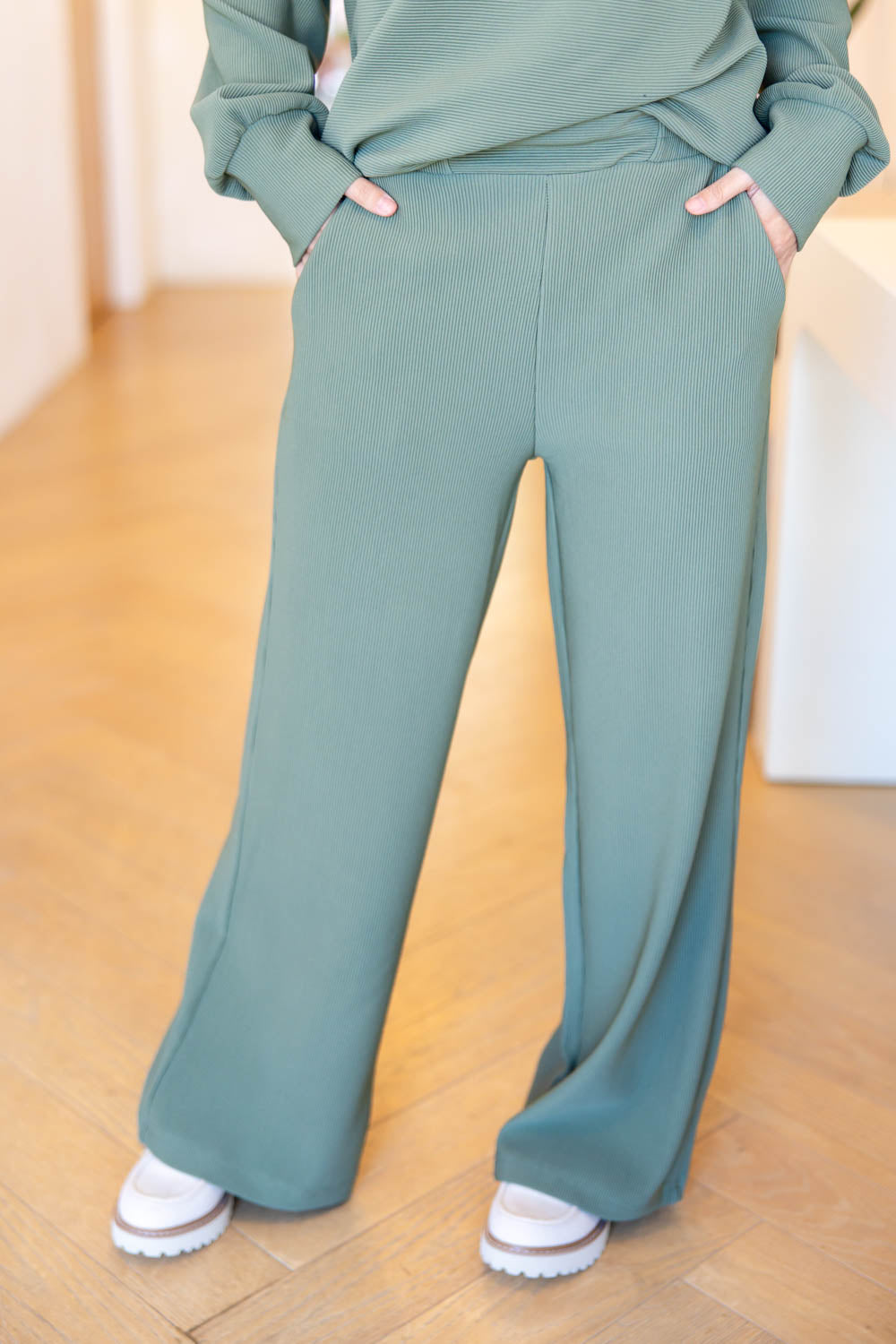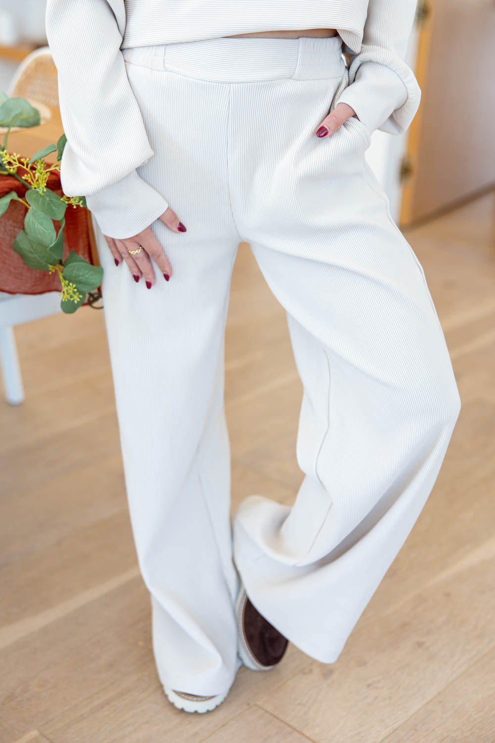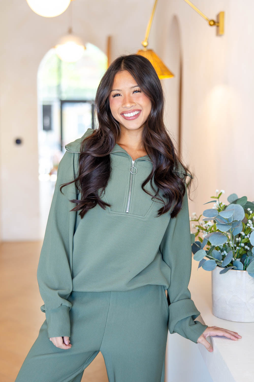 The Relaxed Roots Lounge Set delivers elevated comfort with modern edge. This cozy two-piece features wide leg pants with an elastic waistband and side pockets for effortless ease. The matching half-zip pullover is designed with an oversized collar, exaggerated cuffed sleeves, and a sleek hoop zipper for a contemporary twist. Made from ultra-soft ribbed material and cut to a relaxed fit, the hip-length top layers perfectly over leggings or styles seamlessly with the matching pants for a head-to-toe look that’s as chic as it is comfortable.