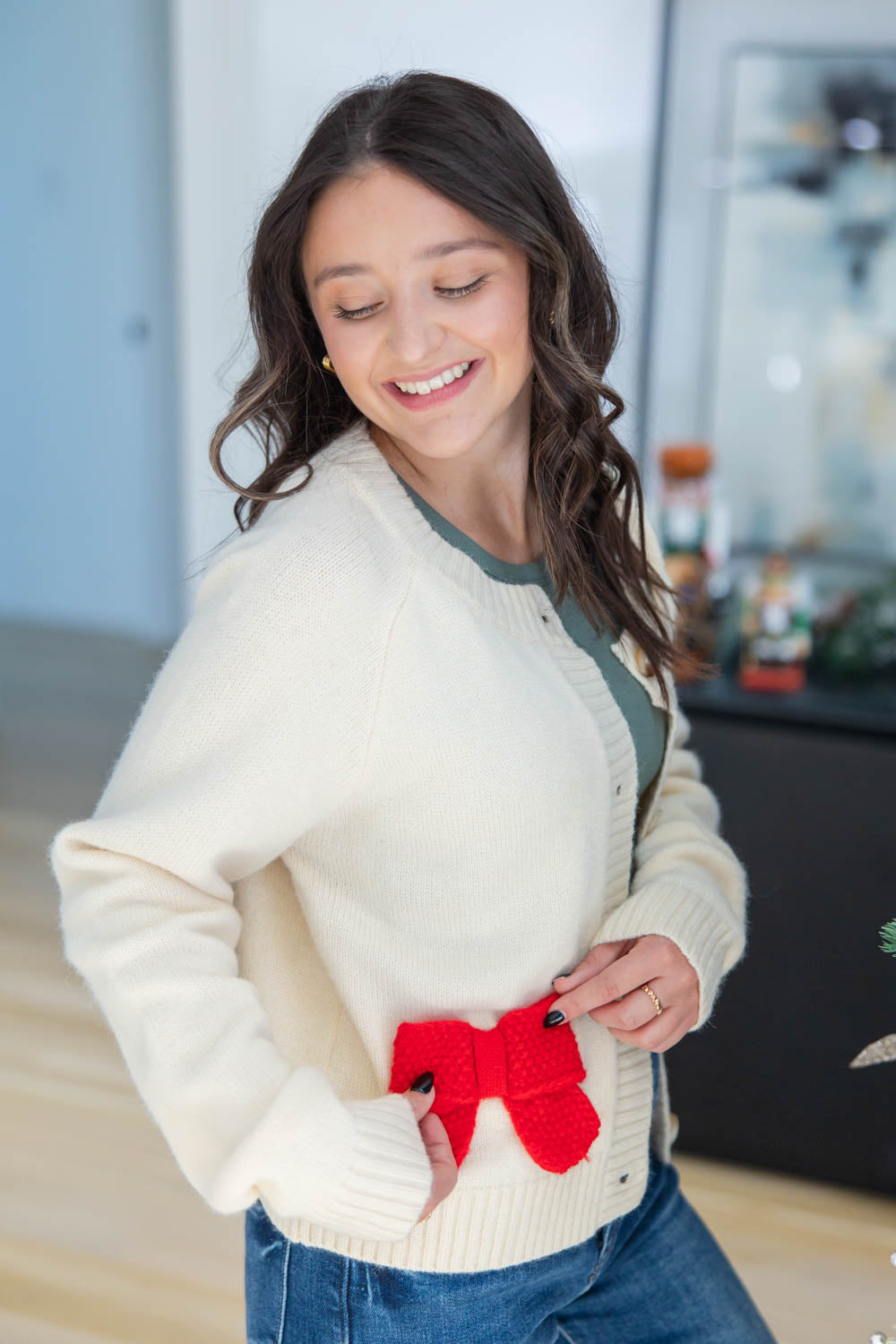 The Ribbon Ready Bow Cardigan Sweater is sweet, soft, and made to charm. Crafted from a cozy knit material, this waist-length cardigan features a relaxed fit that layers effortlessly over your favorite holiday looks. Functional tortoise buttons down the front add a classic touch, while the red knit bows scattered across the front bring just the right amount of festive flair. Rib knit trim at the neckline, placket, cuffs, and hem keeps it feeling polished and snug. Whether you’re heading to a holiday brunch or wrapping gifts by the fire, this cardigan is all about merry moments in the most wearable way.
