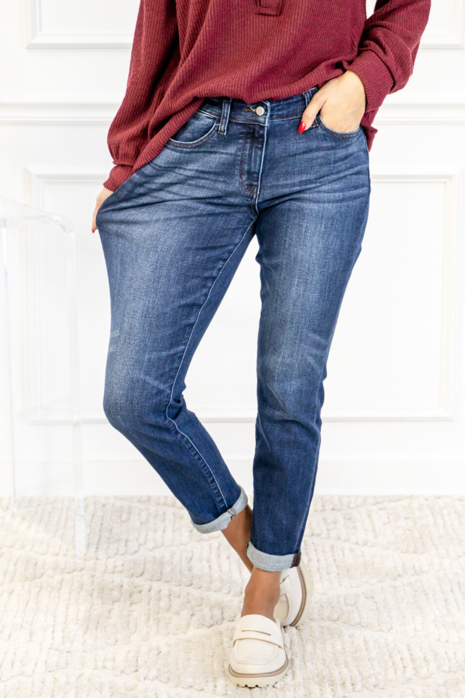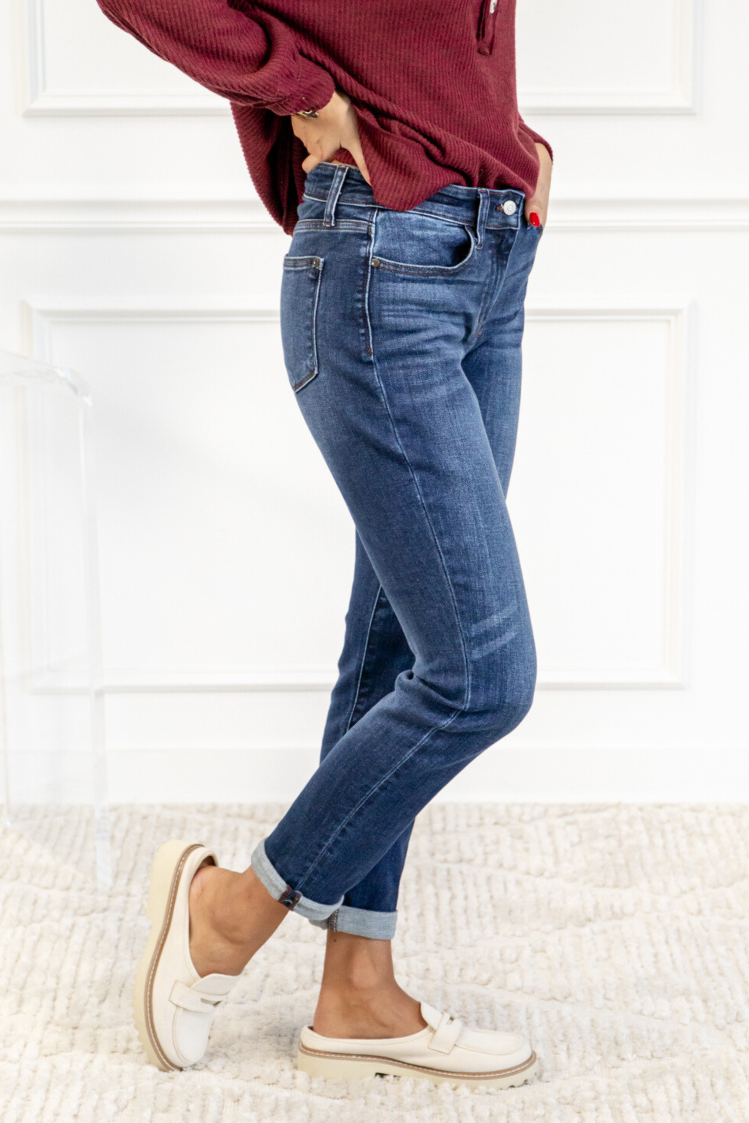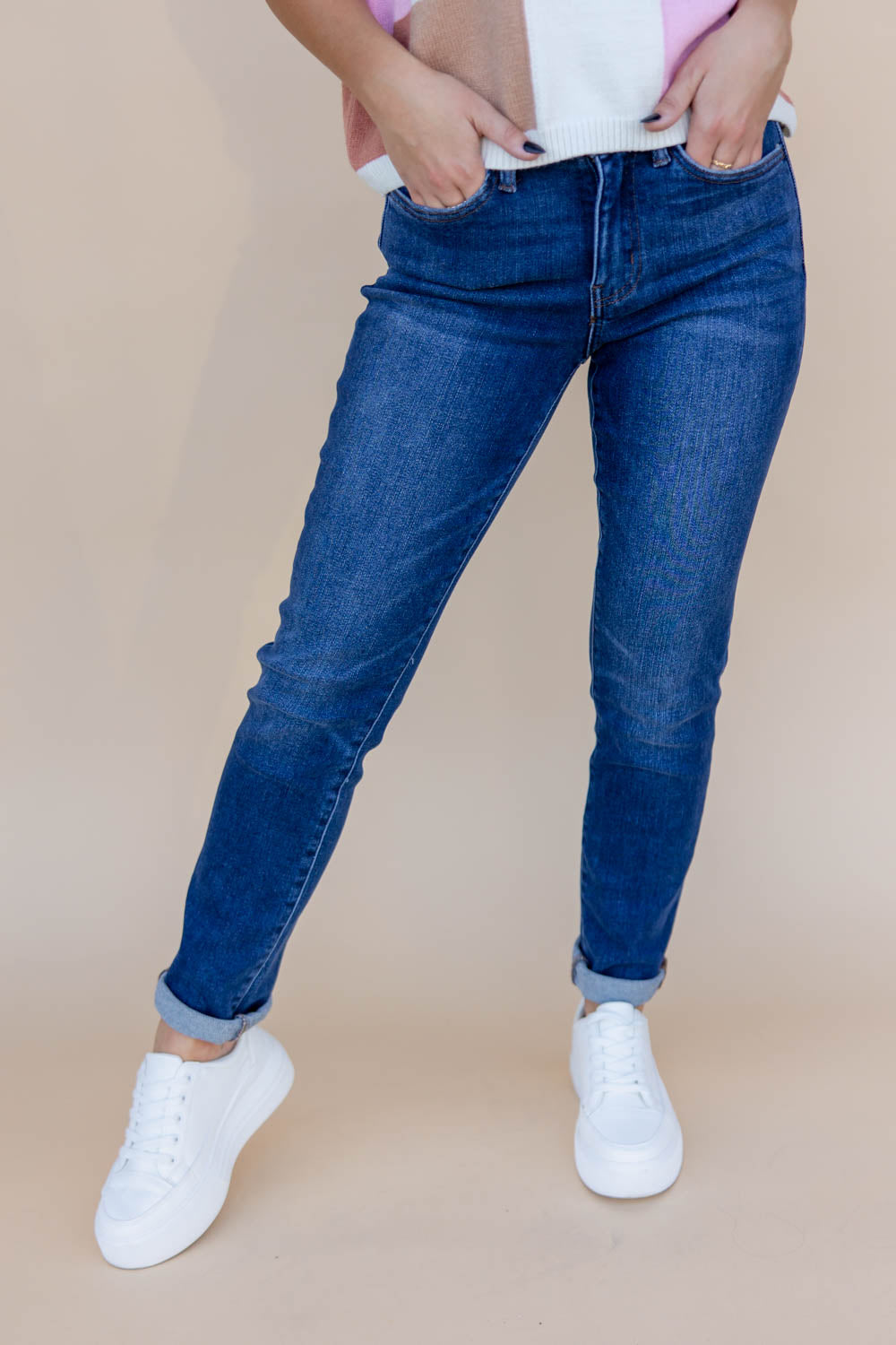 The Ride or Die Non-Distressed Slim Fit Jeans are your everyday denim with a refined edge. Featuring a mid rise and slim fit, they offer that relaxed look without going baggy. The dark blue wash keeps things classic and polished, while slight whiskering adds just the right touch of lived-in character. Clean and non-distressed, these jeans are as versatile as they come. Wear them cuffed with sneakers for a casual day out or uncuffed with ankle boots for a more streamlined look. Comfortable, flattering, and easy to style, they’re the pair you'll reach for again and again.