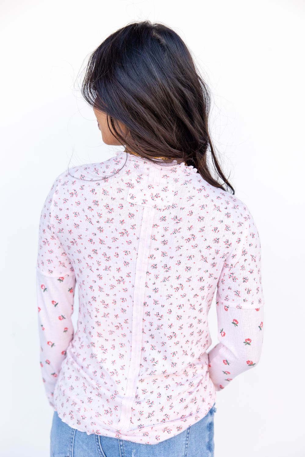 The Rosewater Romance Long Sleeve Top is all about laid-back charm with delicate details. With a relaxed fit and hip-length cut, it features a round neckline and a dainty floral print that’s sweet without being too precious. Contrasting floral sleeves add a playful twist, while lettuce trim along the neck, cuffs, and hem keeps things soft and feminine. A back middle seam adds a subtle finishing touch, making this top an easy pick for your throw-on-and-go days.