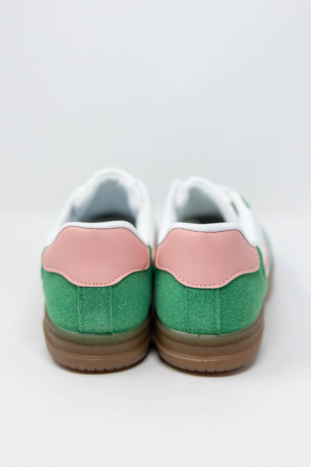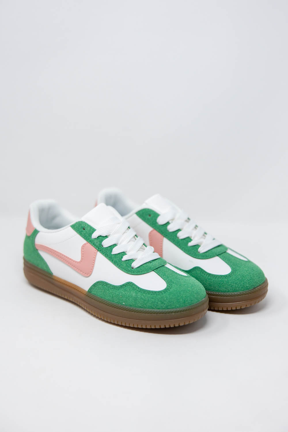 The Run It Back Sneakers delivers everyday comfort with a playful edge. A cushioned insole and durable rubber outsole keep every step supported, while the flat sole and round toe offer an easy, natural fit. Crafted from vegan leather and suede, it gives you texture and style without sacrificing comfort. The lace up design keeps the fit secure. Choose bold green with pink accents for a fun pop of color, or neutral brown tones for a versatile, wear with everything look.