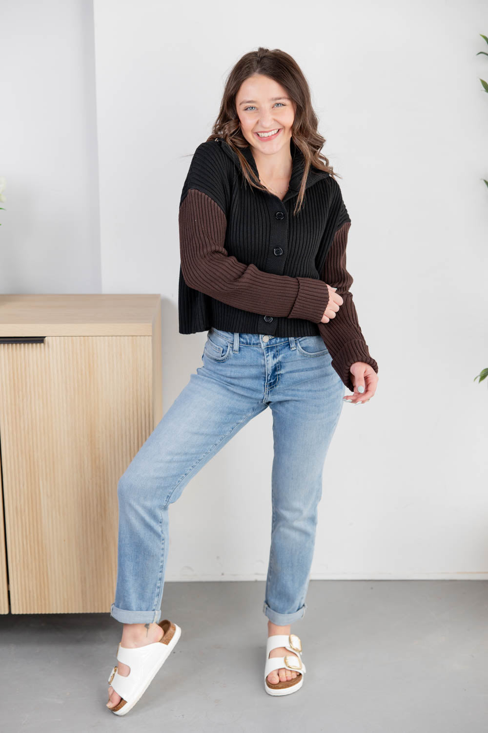 The She Means Cozy Sweater Jacket is your go-to layer with a bold twist. With a relaxed fit and cropped length, it features a classic collared neckline and functional button front for that timeless feel. The mid-weight ribbed fabric adds cozy texture, while the contrasting long sleeves bring an unexpected pop of personality. Pair it with high-rise denim or layered over a fitted tank for an effortlessly cool combo.