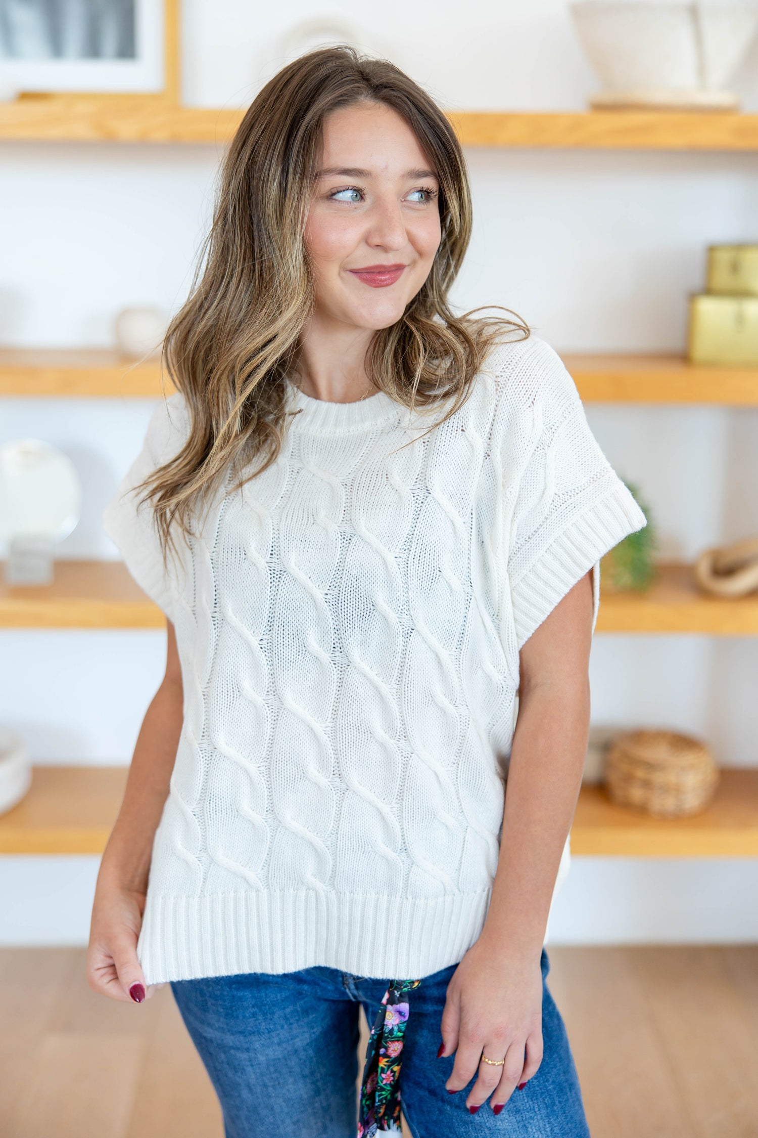 The Soft Girl Season Cable Knit Sweater brings cozy texture to a laid-back silhouette. With an oversized fit and hip-length cut, it’s made for relaxed styling that still feels pulled together. The crew neckline and short sleeves keep it classic, while the mid-weight cable knit adds rich dimension. Ribbed trim at the neckline, sleeves, and hem finishes the look. Pair it with tailored trousers for contrast or go full comfort with leggings and boots for an effortlessly cool outfit.