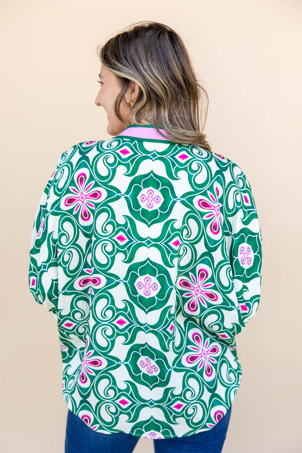 The Soul Flower Swing Short Sleeve Dolman Top brings bold pattern and breezy comfort into one easy statement piece. With an oversized fit and hip-length cut, it features a flattering faux wrap V-neckline and half dolman sleeves finished with soft elastic for subtle shape. The geometric floral print adds visual flair, while the contrasting pink collar and placket give it a playful, unexpected twist. Made from lightweight fabric, it pairs effortlessly with denim or tailored pants for a laid-back yet standout look.