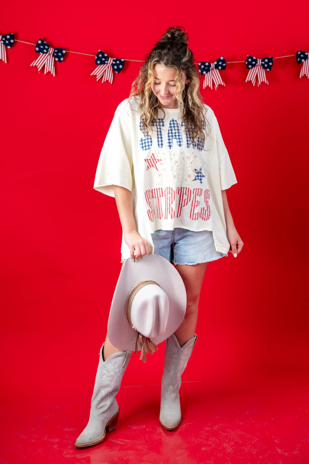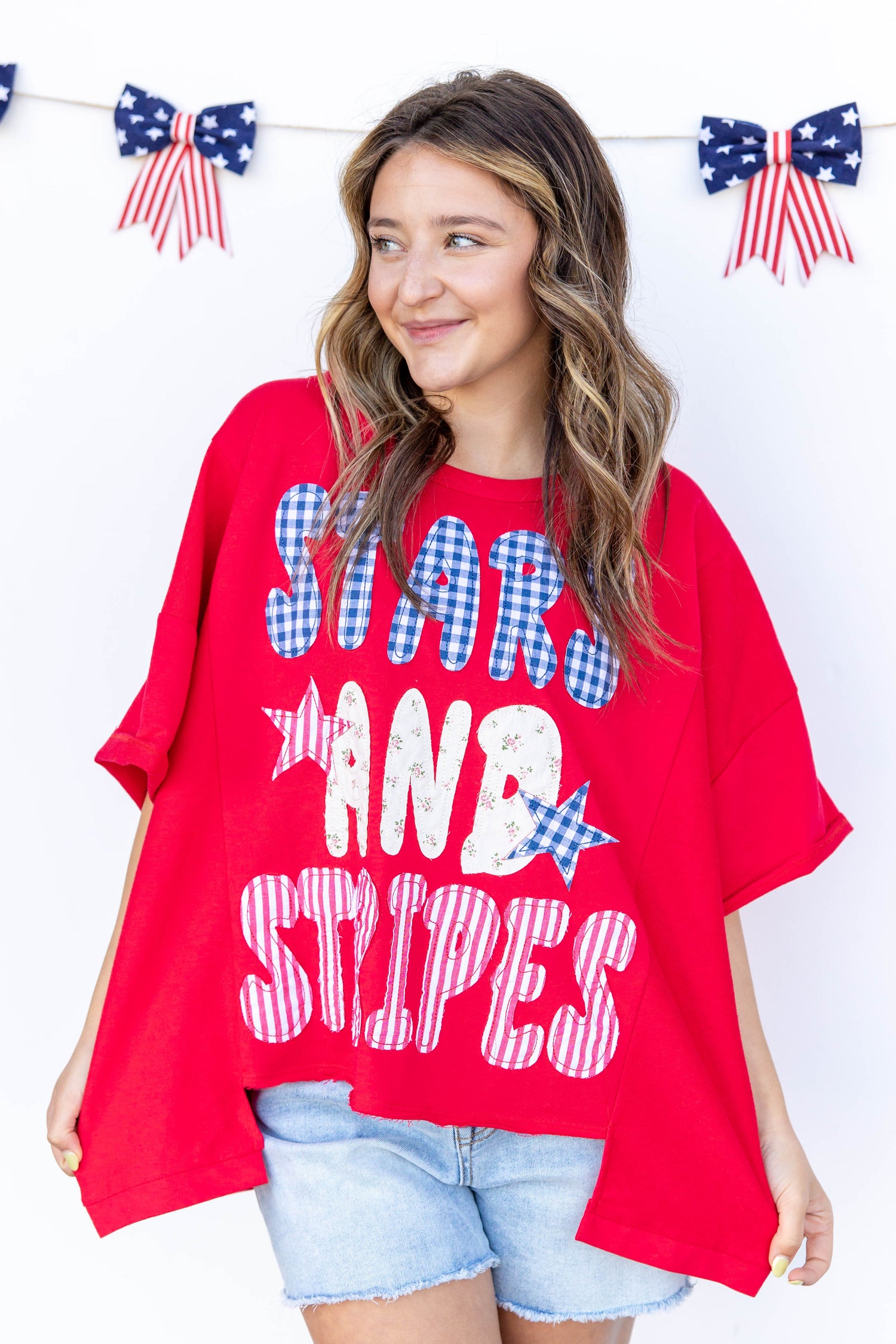 Easygoing and full of character, the Stars And Stripes Patchwork Short Sleeve Top makes casual outfits feel more fun. The oversized fit creates a relaxed drape that feels comfortable all day, while the hip length gives you great coverage with shorts or denim. A classic crew neckline and half sleeves keep the look timeless. The hi low split hem adds movement and styling flexibility. Patchwork stars and “Stars and Stripes” text in gingham, stripe, and floral prints add playful texture and vintage charm.