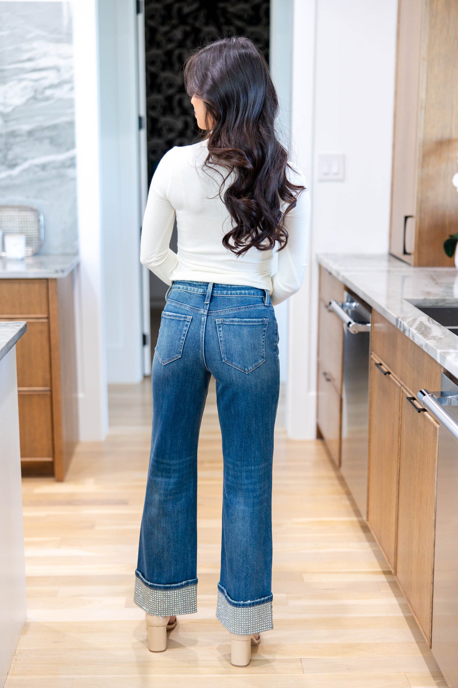 These Starstruck Rhinestone Cuff Jeans bring classic denim together with a bold, sparkly twist. Designed with a mid rise and slim wide leg silhouette, they feature a timeless medium wash and a statement oversized folded cuff. Embellished with studded rhinestones along the cuff, these jeans add just the right touch of shine without going over the top. Non-distressed and finished with a button and zip closure, they're perfect for elevating your everyday look or dressing up for a night out.