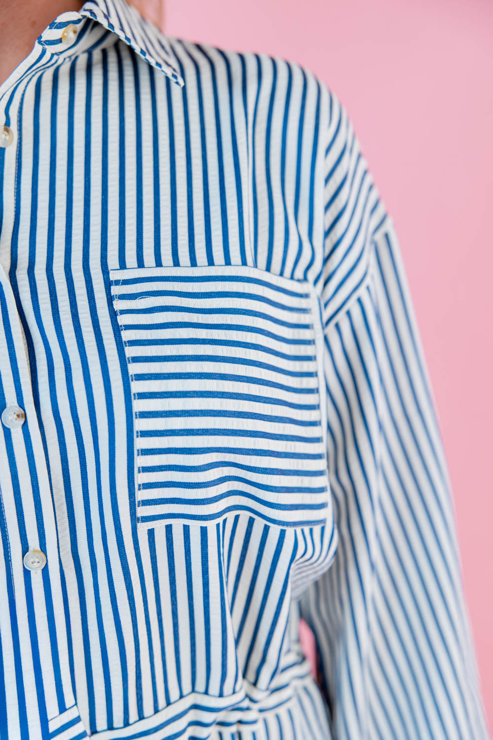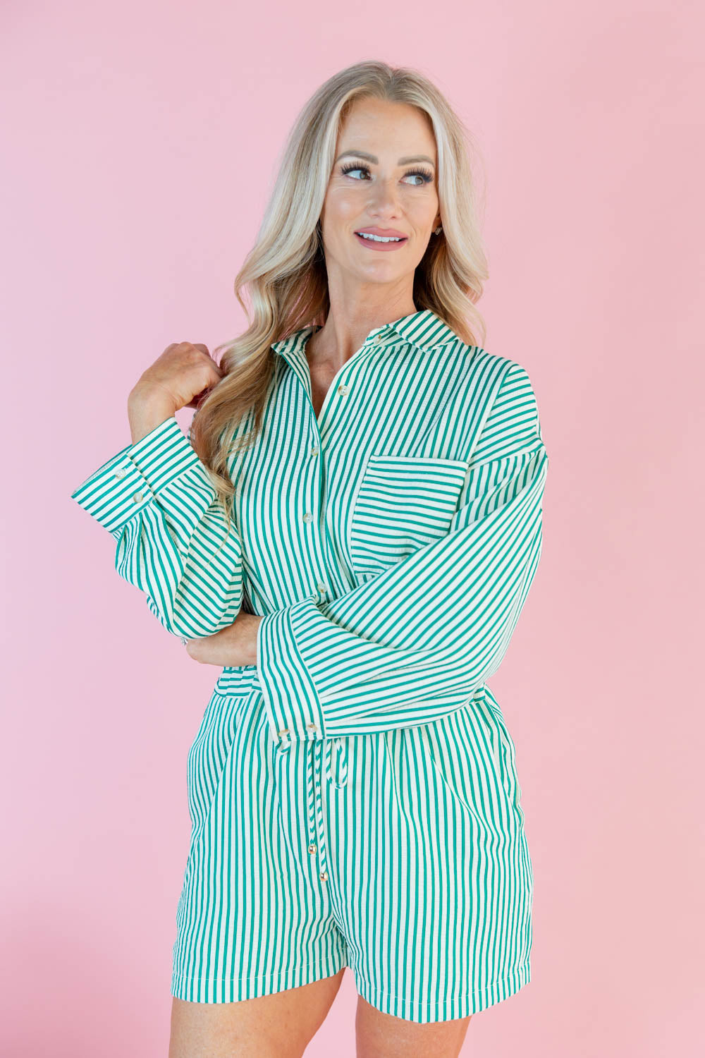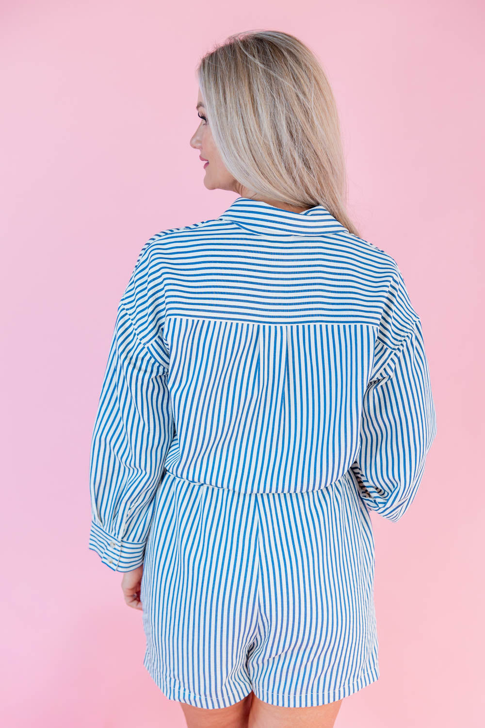 The Stripe & Sunshine Romper makes getting dressed effortless. The relaxed fit keeps it comfortable without feeling oversized, while the lightweight fabric feels easy all day. A collared button front adds polished structure, and long sleeves give you versatile coverage. The drawstring elastic waistband defines your shape while staying flexible. Mid thigh length shorts keep the look playful and practical, and front pockets add everyday function. Finished in a classic striped pattern, this romper is equal parts laid back and put together.
