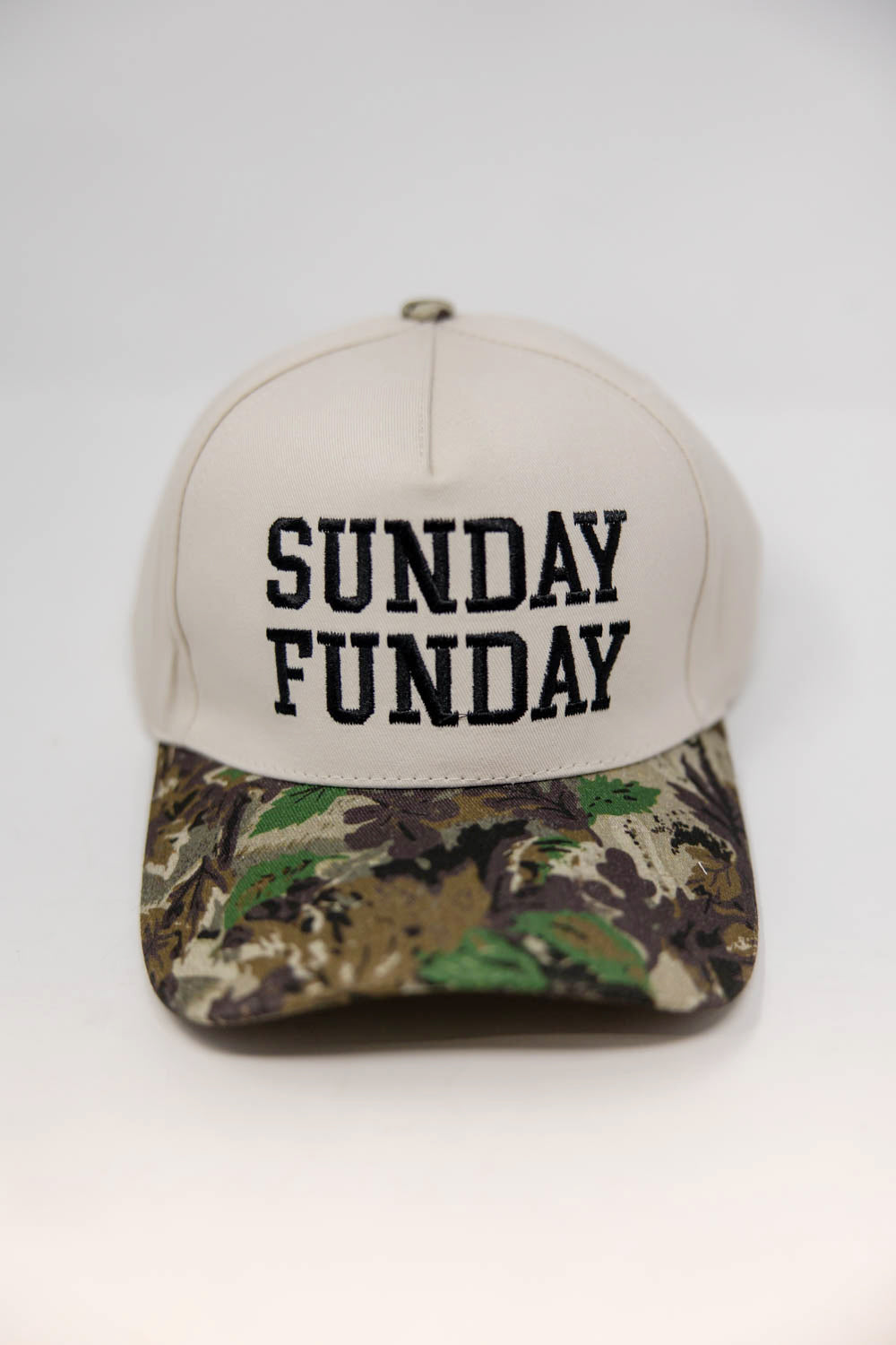 The Sunday Funday Baseball Cap brings laid-back style to your off-duty look. Made from lightweight material for all day comfort, this classic baseball cap features bold “Sunday Funday” embroidery that says it all. A contrasting visor and top button add a playful edge, available in neutral tones or camo print for a versatile finish. The adjustable back closure ensures a just-right fit, and the one size fits most design makes it easy to grab and go. Whether you're brunching, lounging, or out and about, this cap is ready for whatever your Sunday brings.