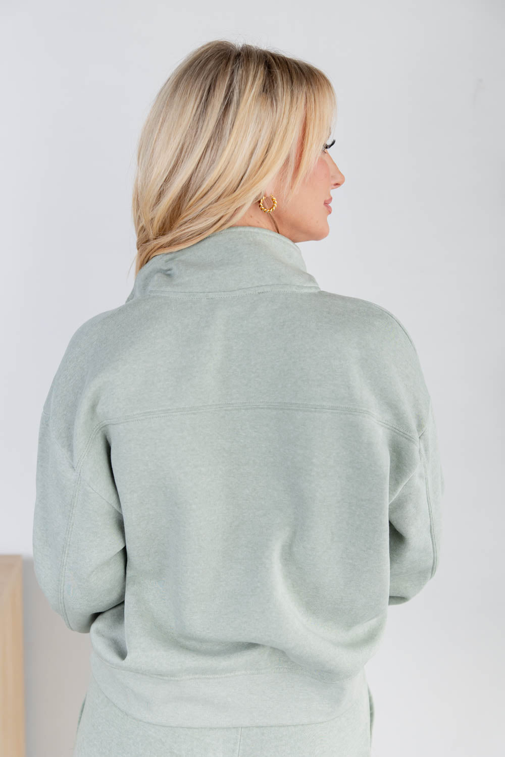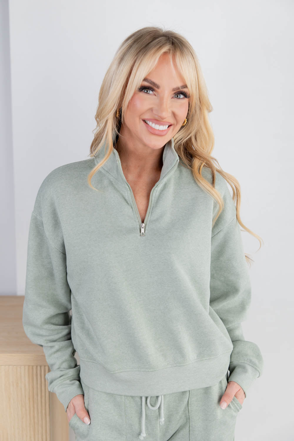 Part of a cozy matching set, the Sunday Snuggles Half Zip Sweatshirt delivers soft structure with all-day comfort. Its relaxed fit and semi-cropped length create an easy, flattering shape, while the lightweight fabric keeps it breathable. A collared half-zip adds a sporty touch, and drop shoulders with cinched cuffs and hem complete the laid-back look. Perfect on its own or paired with the matching wide leg pants for a coordinated outfit.