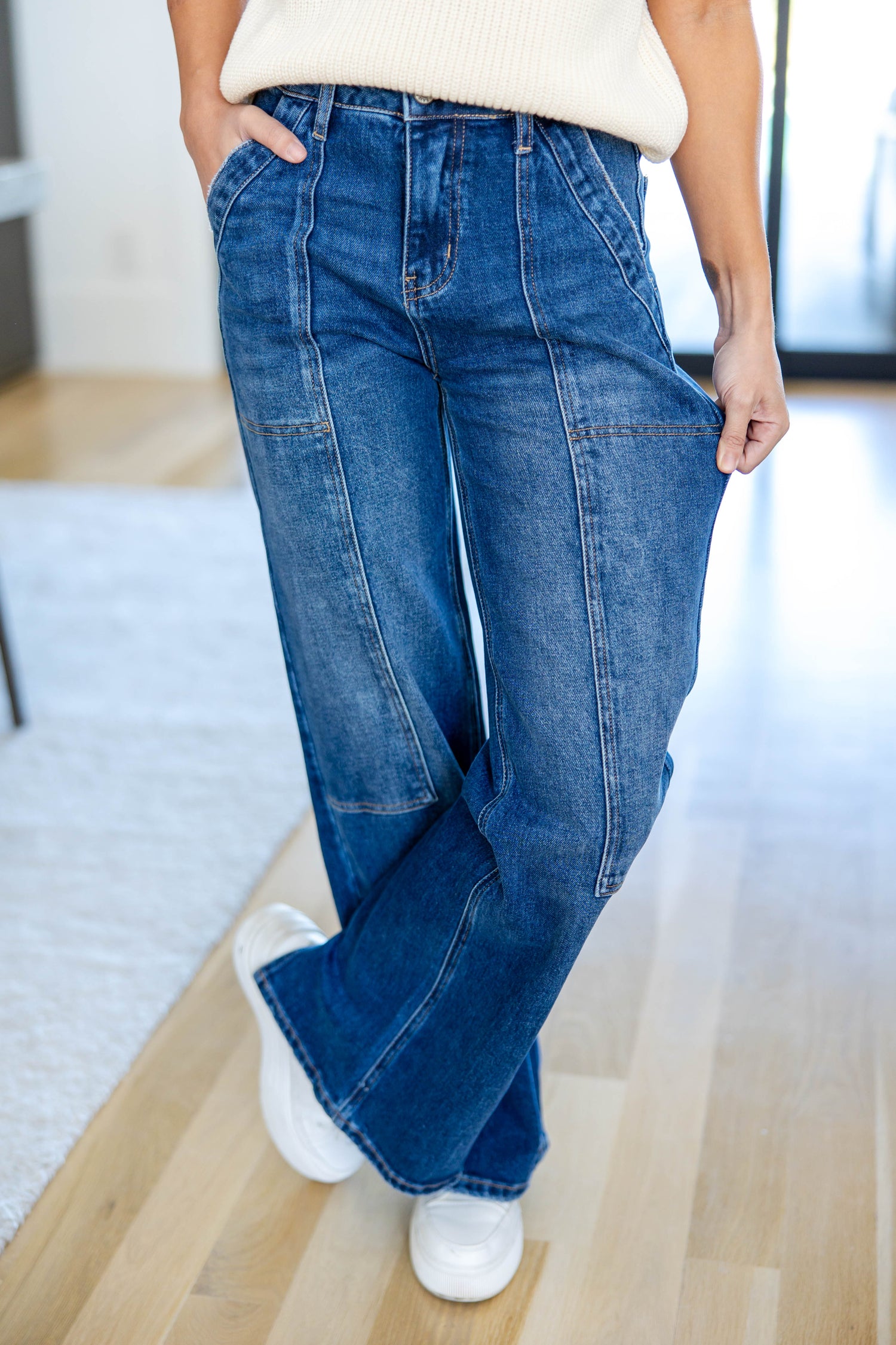 The Sweet Escape Wide Leg Jeans bring a clean, modern edge to classic denim. With a high rise and wide leg silhouette, they offer a flattering, elongated fit in a versatile medium wash. Utility-style front pockets add subtle structure, while a center seam down the back legs and finished split hems in the back give them standout detail without distressing. Finished with a button and zip closure, these jeans pair perfectly with fitted knits, tucked-in blouses, or oversized layers for a look that’s effortlessly put-together.