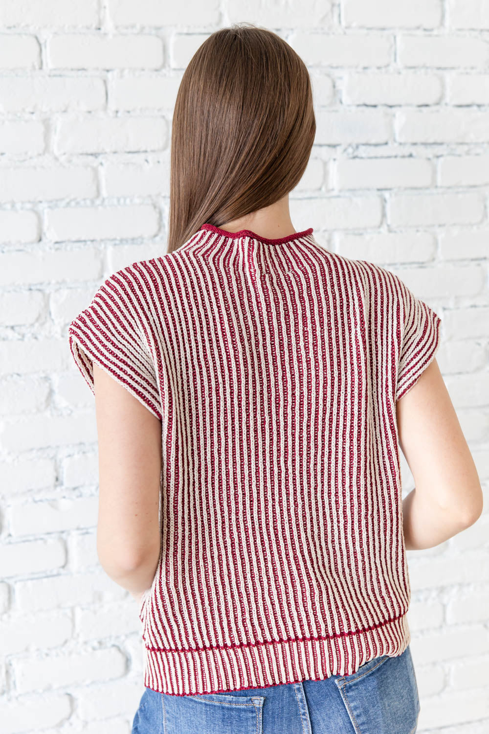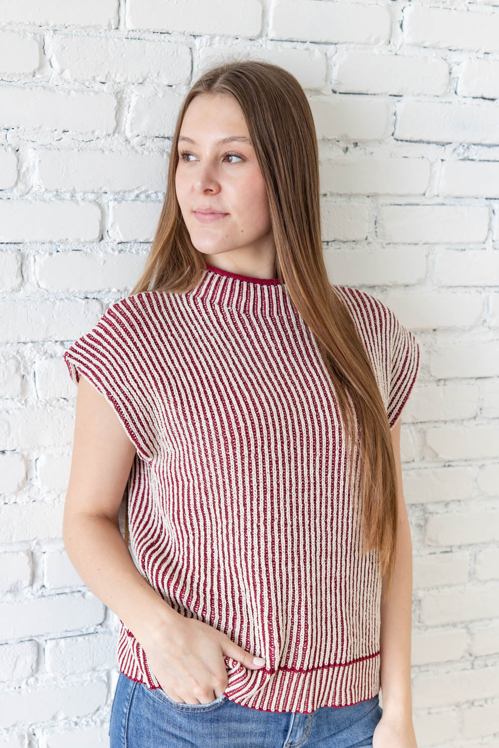 The Textured Touch Short Sleeve Sweater brings an elevated edge to cozy staples. Designed with an oversized fit and hip length cut, it features a mock neckline and cap sleeves for a modern, structured shape. The mid-weight knit adds just the right amount of warmth, while the ribbed two-tone stripe pattern keeps things crisp and graphic. Perfect for layering over a long sleeve or pairing with wide leg denim for a clean, cool-weather look.