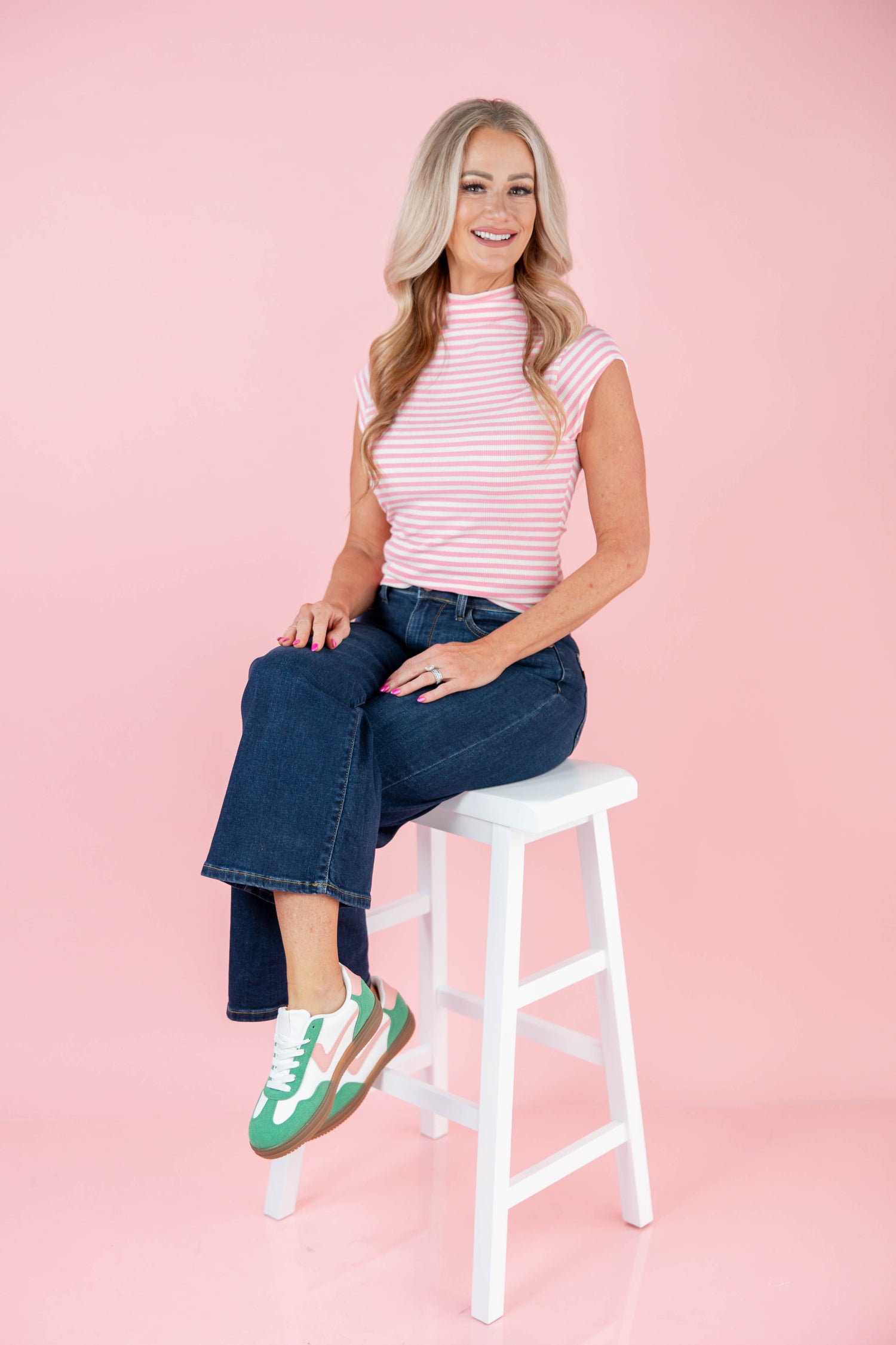 The Lovely Line Mock Neck Top is made to highlight your shape while keeping things easy. The fitted, true to size silhouette flatters without feeling restrictive, and the semi cropped length pairs perfectly with high rise denim. A ruched mock neckline adds soft texture and a touch of polish, while cap sleeves keep the look balanced and feminine. Crafted from stretchy, lightweight fabric, it moves with you comfortably. Finished in a bright stripe pattern, this is the top that instantly energizes your outfit.