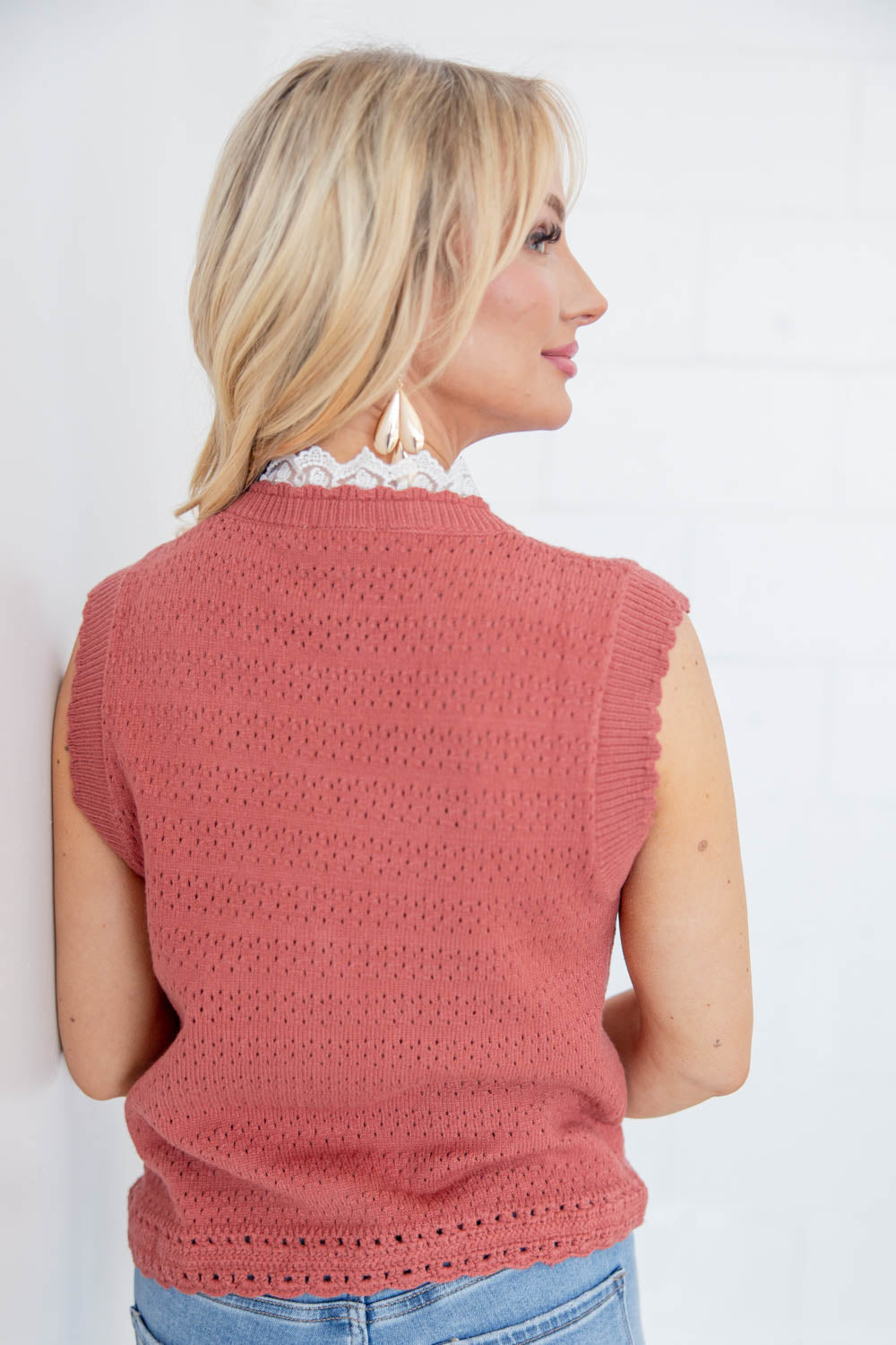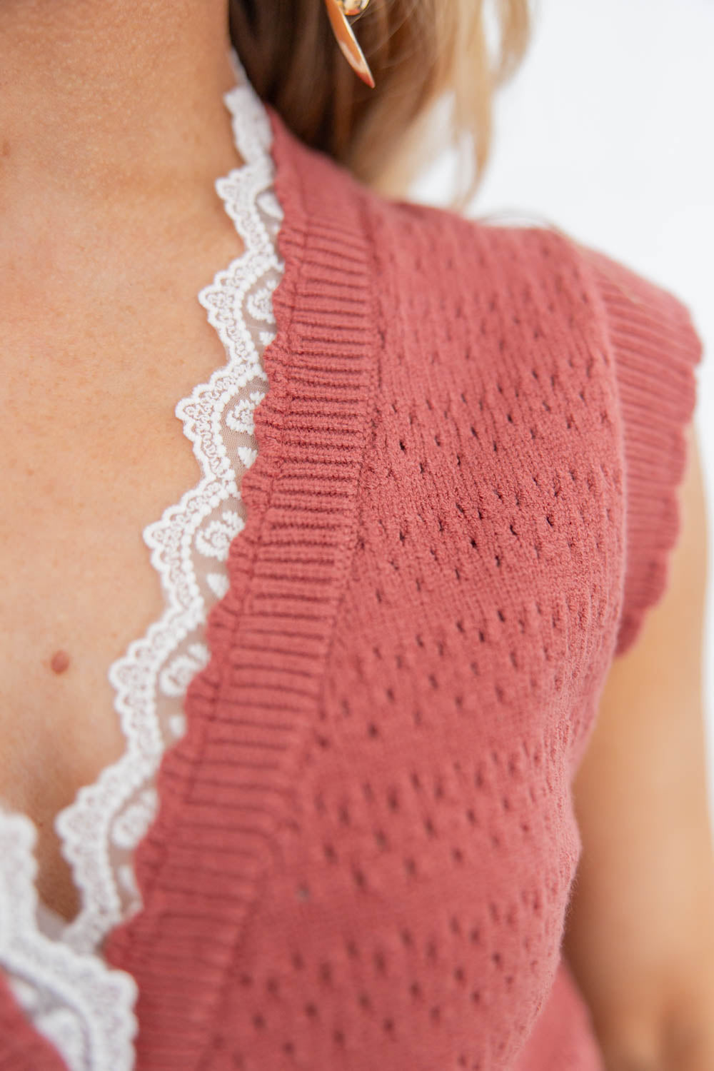 The Trimmed in Love Sleeveless Sweater adds instant polish with minimal effort. Designed true to size, the waist length cut pairs perfectly with high rise denim and skirts. A flattering V neckline trimmed in delicate lace softens the look, while gold buttons down the front bring a refined touch. The sleeveless vest design makes it easy to layer or wear on its own, and the mid weight eyelet knit offers comfortable structure without feeling heavy. Feminine, versatile, and effortlessly elevated.