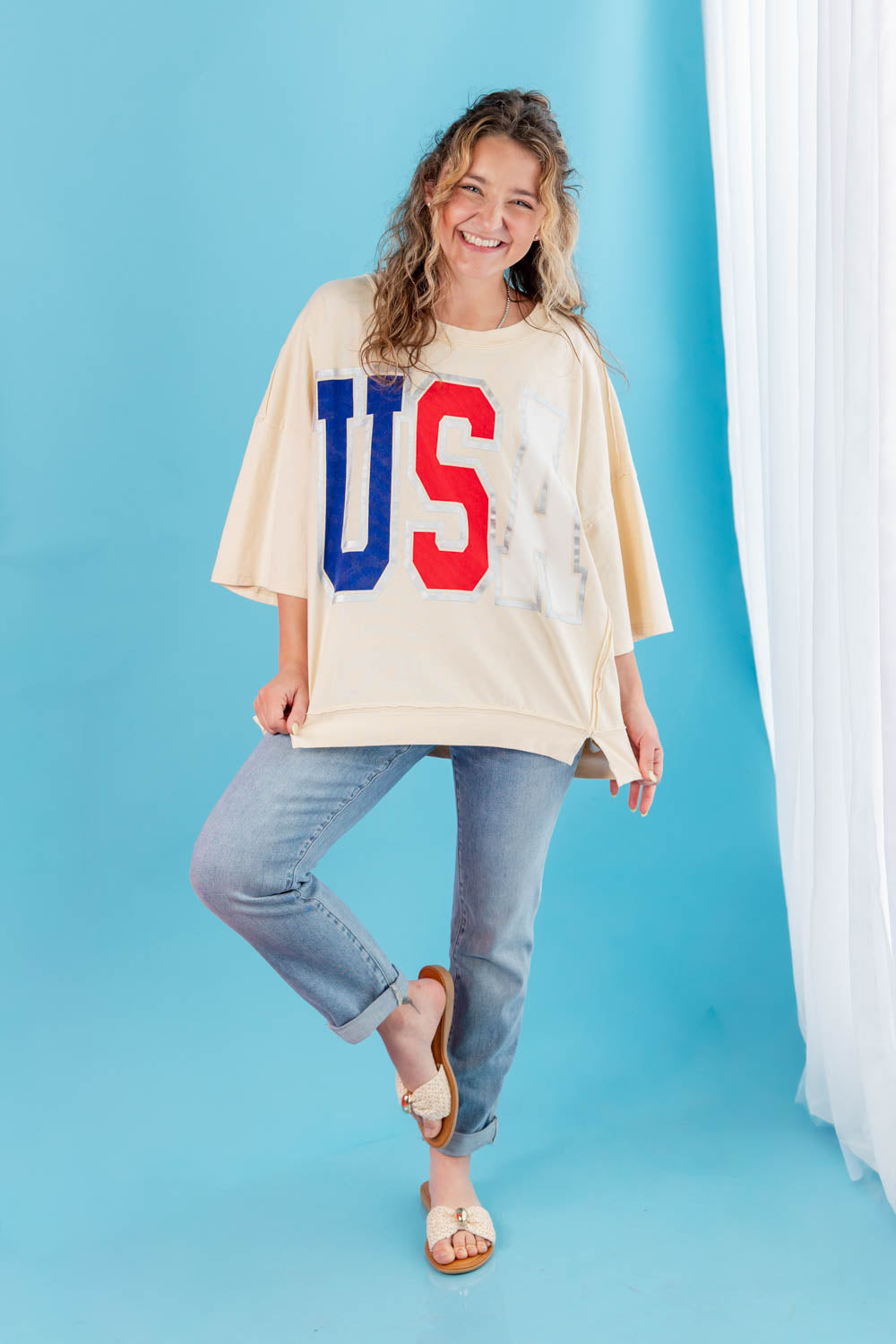 The USA Short Sleeve Top brings laid back spirit with a bold, playful edge. The oversized fit and hip length create an easy, relaxed feel that looks effortlessly cool. A classic crew neckline keeps it timeless, while half sleeves offer comfortable coverage. The hi low split hem adds movement and makes it easy to style with denim or shorts. Finished with varsity style “USA” lettering in blue, white, and red with a silver outline on a cream tee, it delivers standout charm with everyday comfort.
