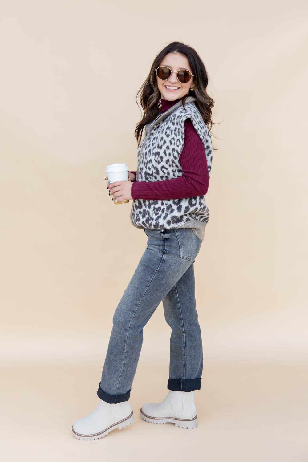 The Sweetly Spotted Sweater Vest brings bold energy to your layering game. With an oversized fit and mid-weight knit, it’s equal parts cozy and cool. The contrasting mock neckline and functional zipper front give it a sporty edge, while the allover leopard print adds serious attitude. Sleeveless with roomy front pockets, this vest is perfect thrown over a fitted tee or layered atop a long-sleeve for an effortlessly edgy look.