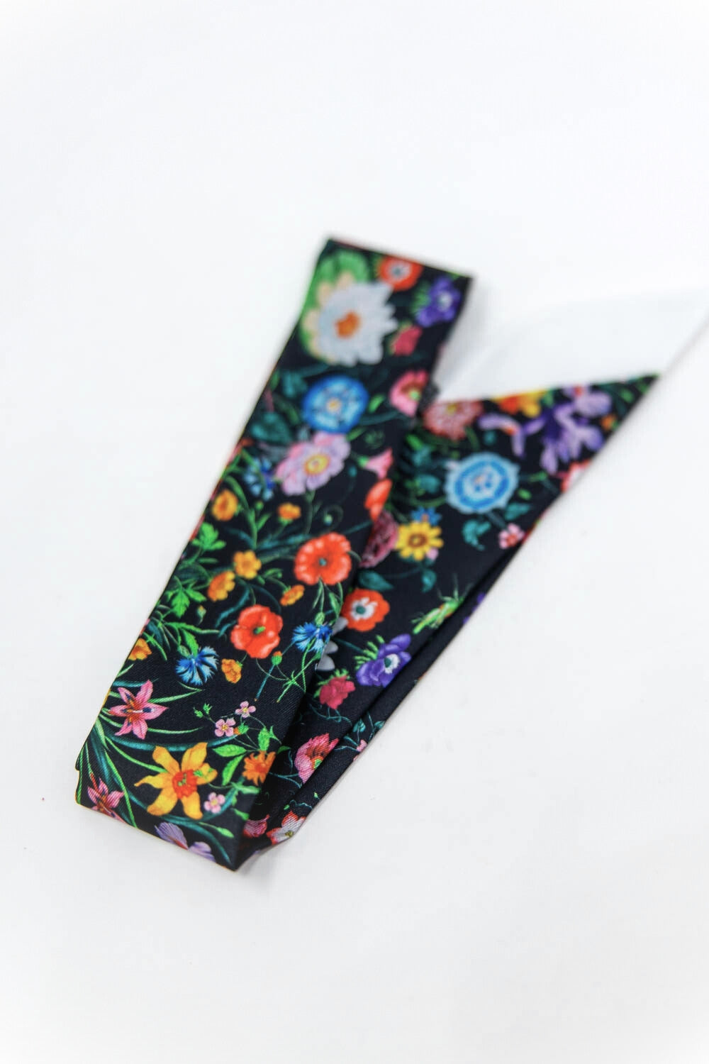 The Wildflower Disco Skinny Scarf is a dainty essential with a touch of drama. Made from luxe satin, this twilly features a black base adorned with a delicate multicolored floral pattern that adds just the right pop. Its slim silhouette makes it perfect for styling around your neck, wrist, hair, or favorite handbag. Lightweight, versatile, and full of charm—it’s the finishing touch your outfit’s been waiting for.